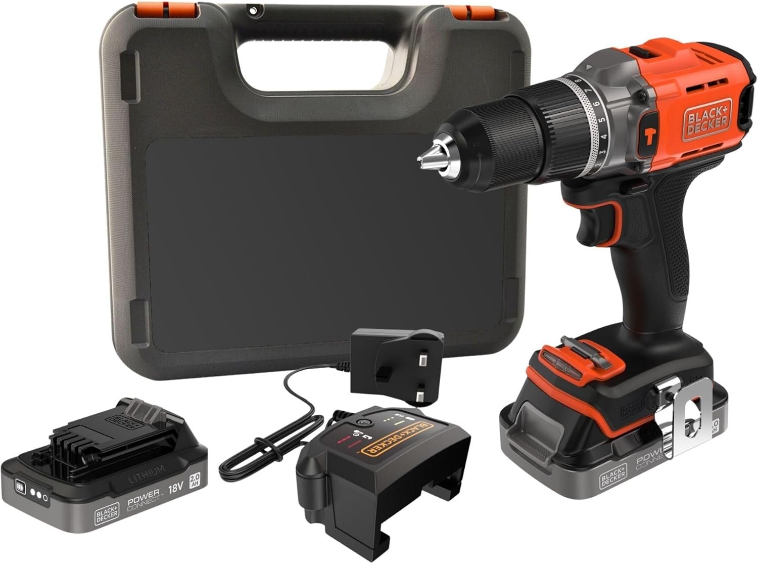 Black+Decker 18V CordlessHammerDrill BD-BCD383D2XK-GB . To begin with, the Black+Decker POWERCONNECT 18V Cordless Hammer Drill offers a reliable blend of power, convenience, and durability. With its 1A charger and kitbox included, this tool is designed for both DIY enthusiasts and professionals. Moreover, it belongs to the POWERCONNECT battery system, which means you can interchange the battery with other compatible tools.