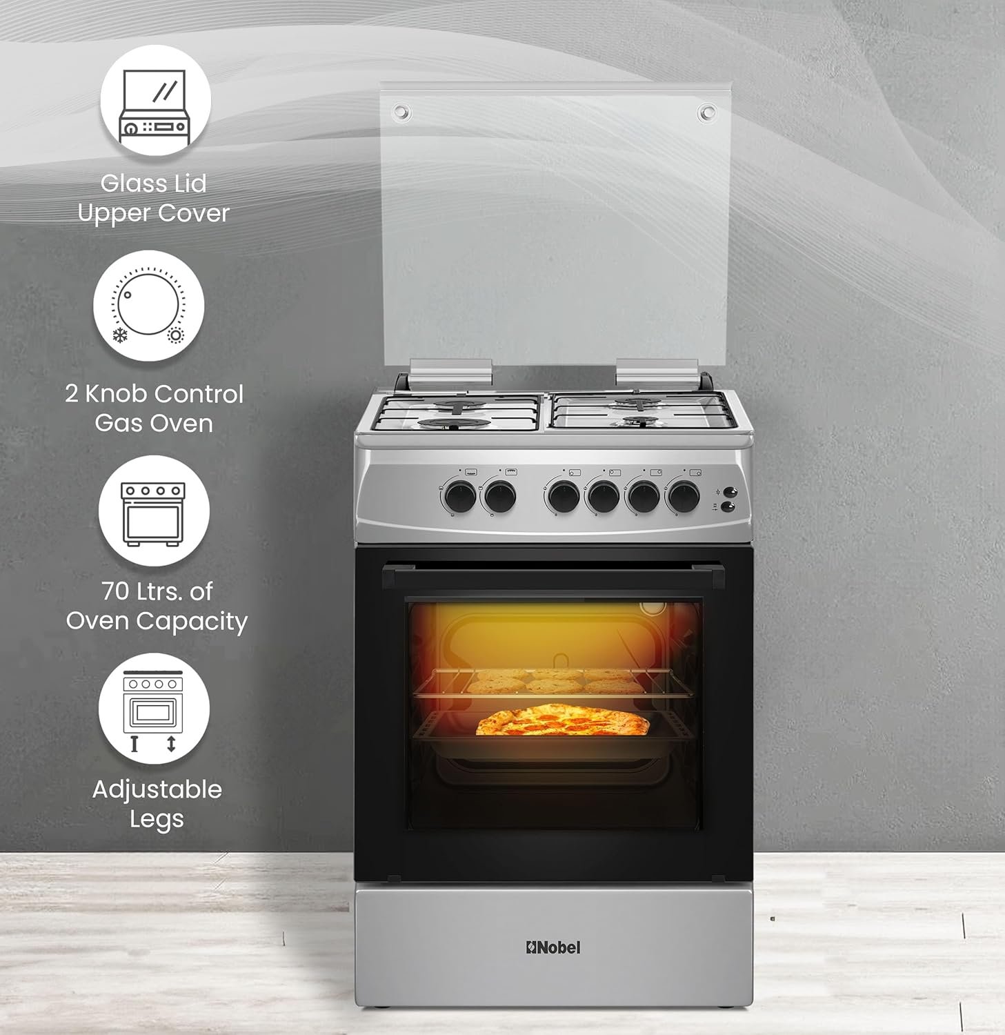 - Nobel equips this range with a generous 70-liter gas oven that supports baking, roasting, and grilling with uniform heat circulation.