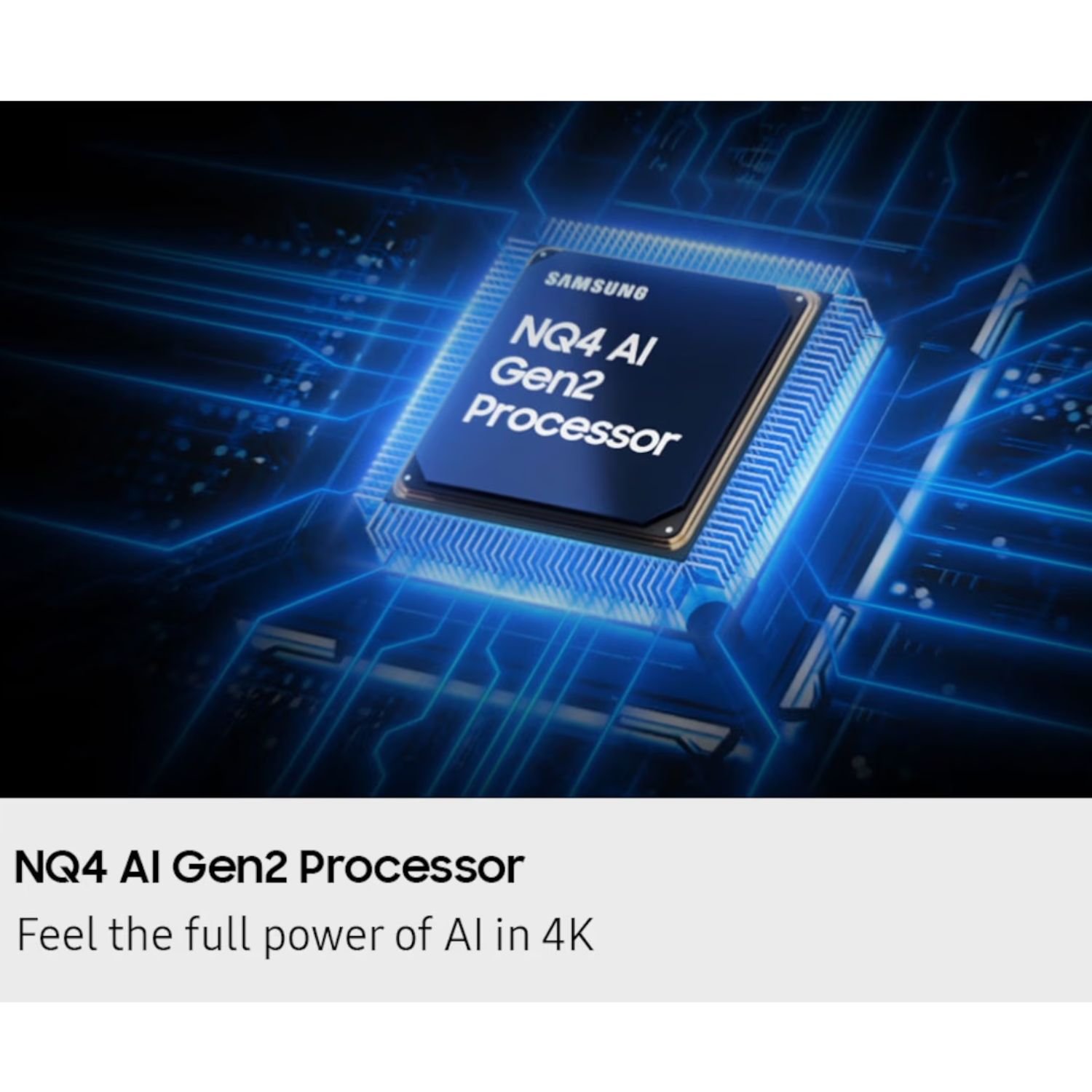 The words Samsung Vision AI with the Samsung AI logo.Samsung NQ4 AI Gen2 Processor chip descends on the TV's main board and lights up with waves of power surging from the chip to the rest of the TV.